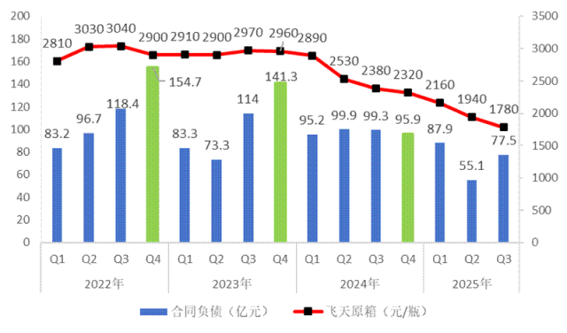 图:2022-2025年贵州茅台合同负债与飞天茅台批价对比图,数据来源:不二酱,公司公告