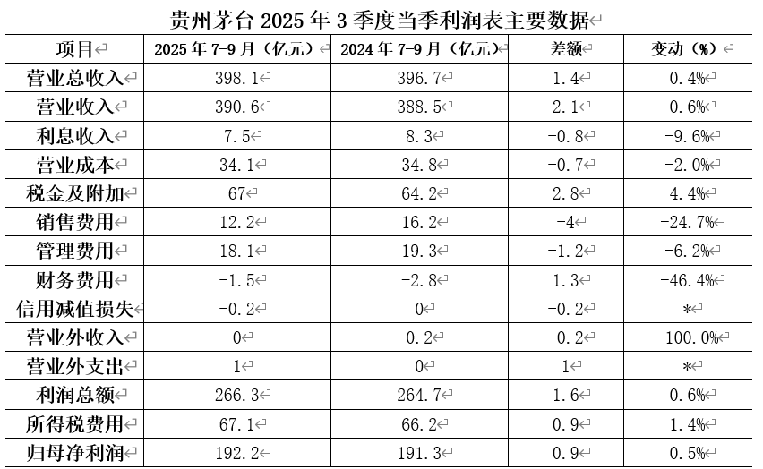 2025年前三季度,贵州茅台实现营业收入1285亿元,同比增长6.4%,实现归母净利润646.3亿元,增长6.3%。三季度,公司实现营业收入391亿元,增长0.6%,实现归母净利润192亿元,增长0.5%,当季营收、盈利实现“精准”微增长。
