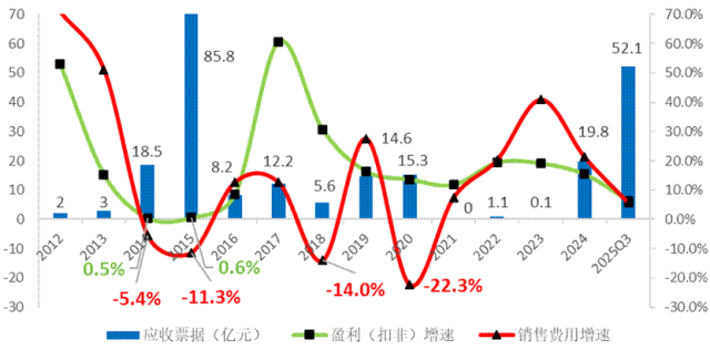 图:贵州茅台2012-2025年盈利、销售费用增速、应收票据对比图,数据来源:Wind,公司公告