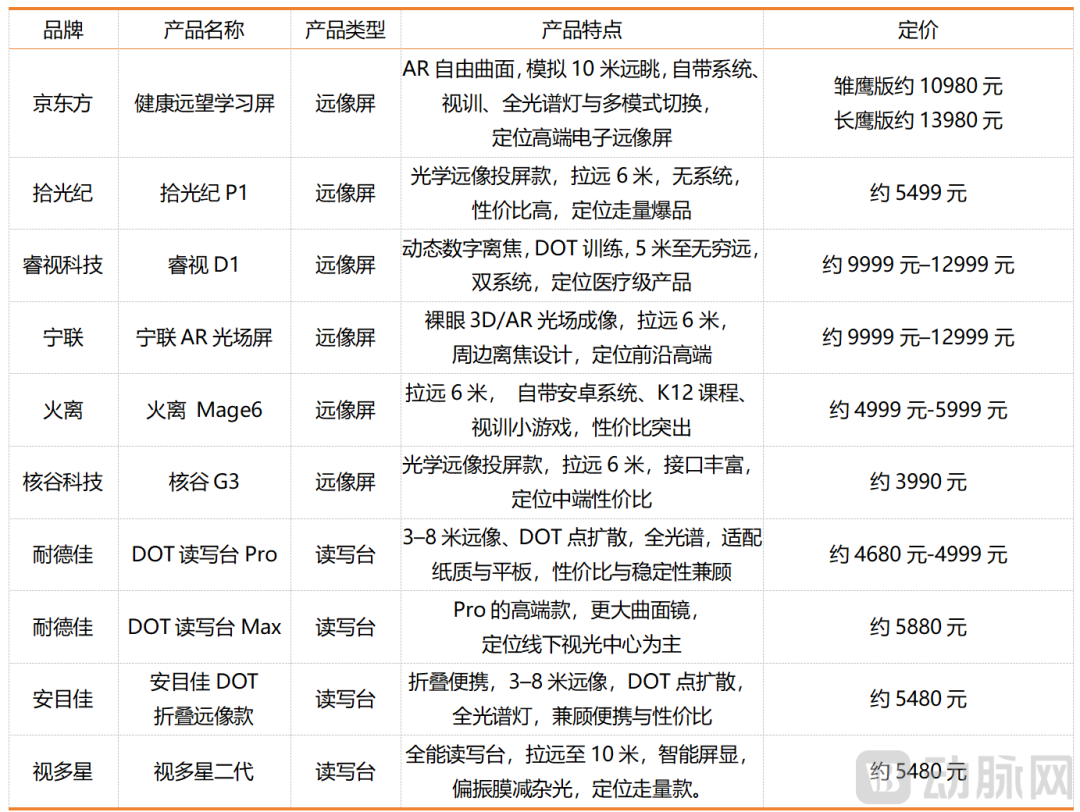 短短数年间,细分赛道中品牌数量由不到10家,猛增到上百家。现阶段,主流的远像屏、读写台品牌分为三类,即京东方、耐德佳等头部企业布局的创新产品线,睿视、视多星等专注于护眼赛道的初创品牌,和许多缺乏核心技术的同质化产品。