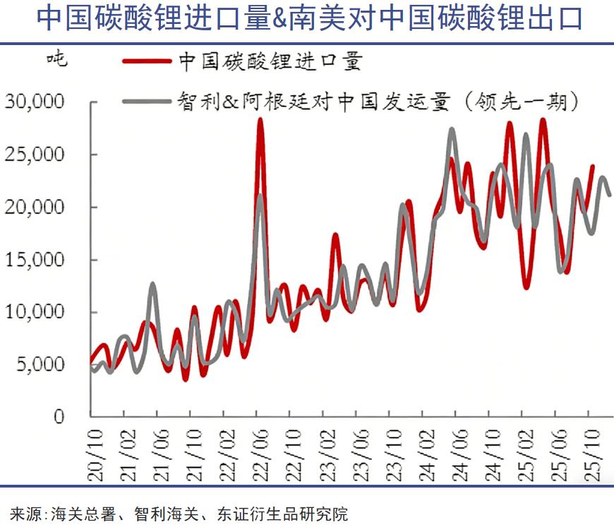 中国的碳酸锂进口离不开南美地区的盐湖锂。海关数据显示,2025年11月中国进口碳酸锂22055吨,其中从智利进口碳酸锂1.08万吨,占进口总量的49%,从阿根廷进口碳酸锂8043吨,占进口总量的36%。