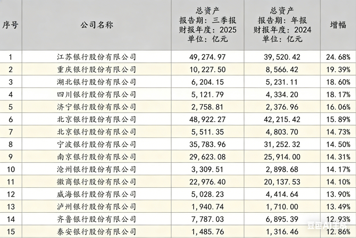 2025年8月29日,重庆银行公告宣布,截至2025年7月31日,该行资产总额达到10087亿元,突破万亿大关,提前完成“十四五”战略规划目标,成为全国首家万亿规模的“A H”股上市城商行。2025年三季报显示,该行资产规模进一步扩大至10227.5亿元。值得注意的是,这一规模较2024年底的8566.42亿元增长19.39%。该增速在全国百余家银行中位列第二,彰显其强劲发展势头。
