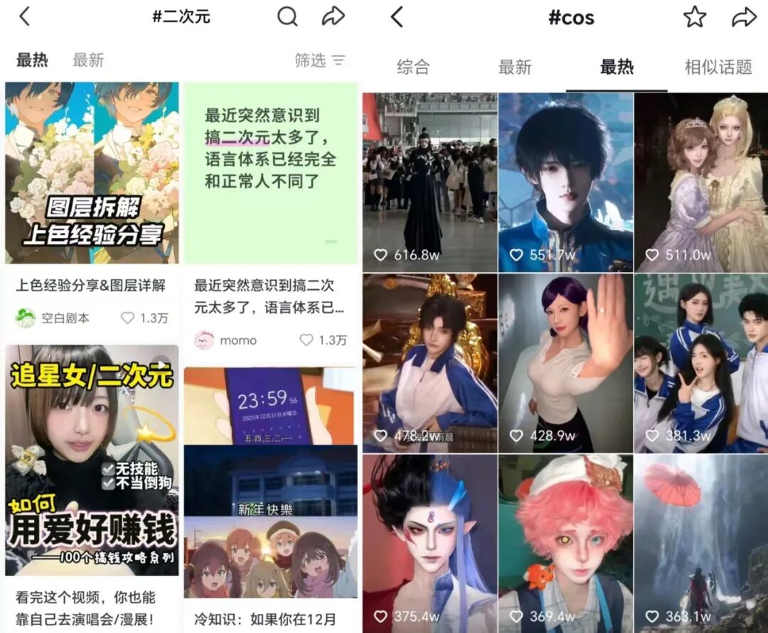 小红书数据显示,二次元已成为平台第三大发布垂类,过去一年内容发布量同比增长175%,兴趣人群规模达1.37亿;抖音上「二次元」话题播放量超11238亿,「cos」话题播放量达1717亿,海量UGC内容让二次元从圈层文化走向大众视野。