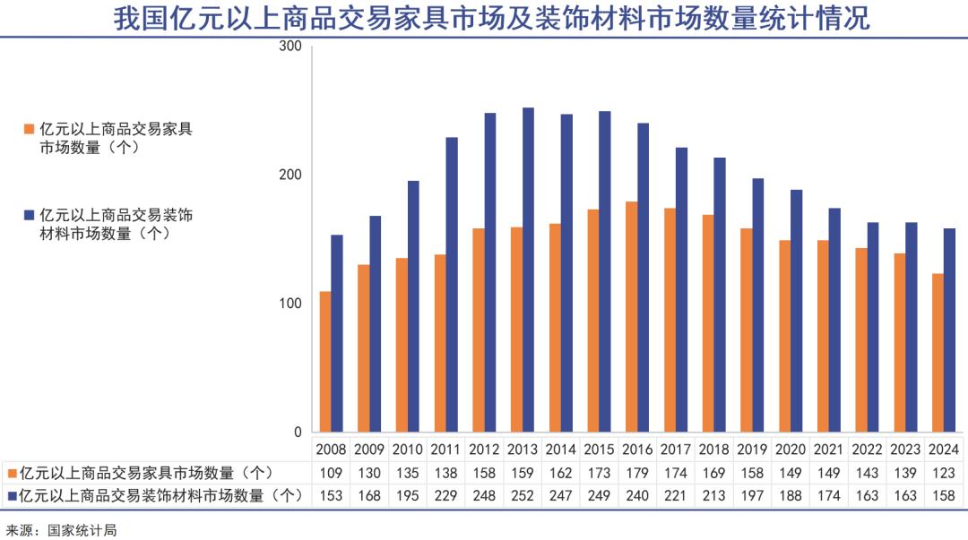 国家统计局的数据显示,我国亿元以上商品交易家具市场的数量从2016年开始下降,装饰材料市场数量从2015年开始下降,到2024年已均不及10年前水平。