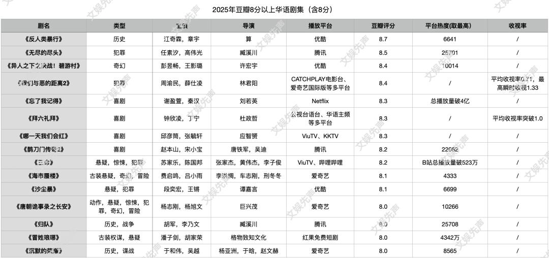 紧随8.7分《反人类暴行》其后的,是评分8.5分的《无尽的尽头》与《异人之下之决战!碧游村》。前者在2025年4月于腾讯视频播出,是由任素汐、高伟光主演,聚焦青少年犯罪题材;后者在2025年1月于优酷播出,是2023年播出的由彭昱畅、王影璐主演《异人之下》续作。