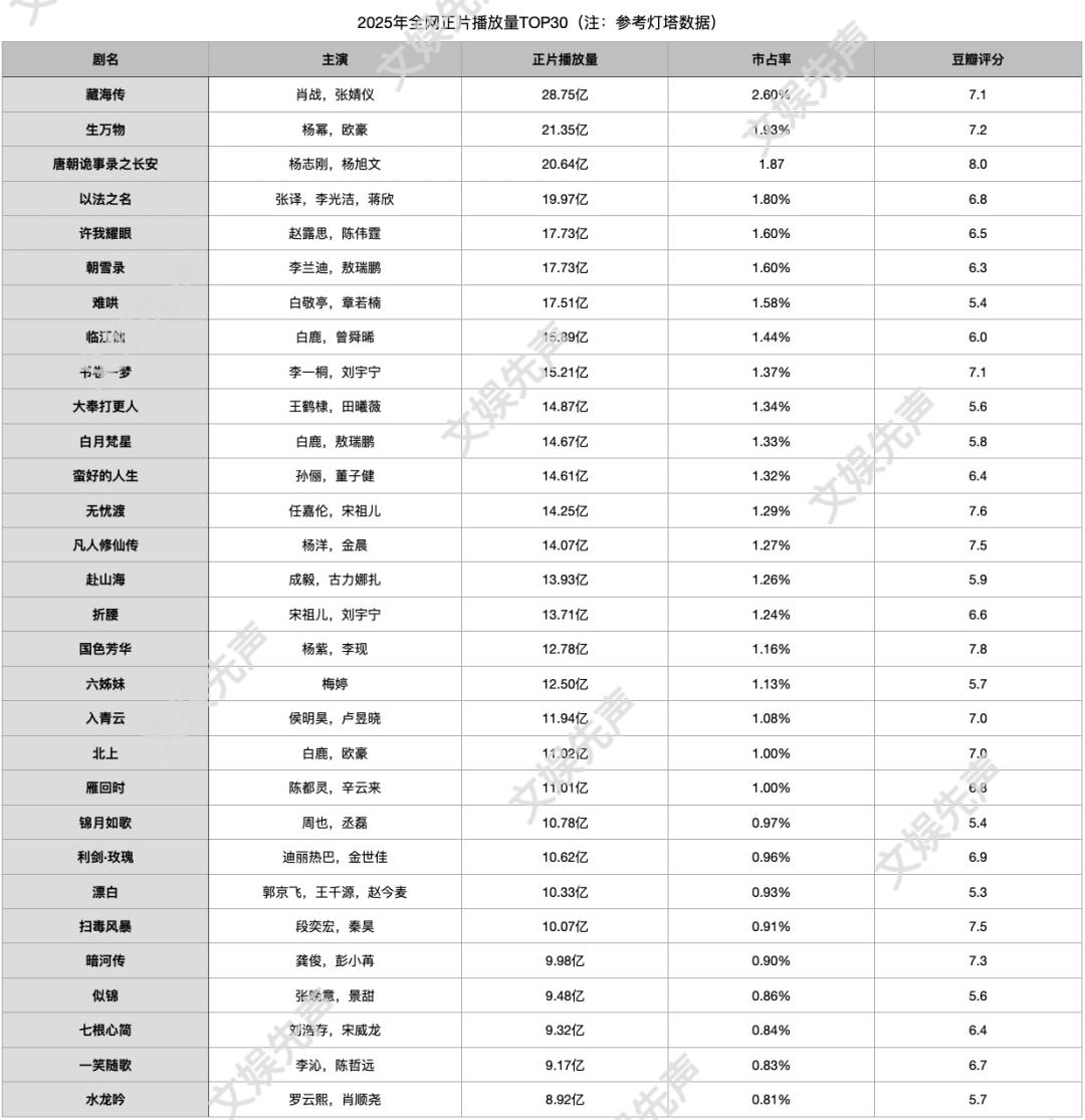 比如根据灯塔专业版2025年年榜显示,截至12月31日,全网正片播放量TOP30中,热播剧集豆瓣评分跨越8分的高分剧集仅有《唐朝诡事录之长安》,7分档位热播剧则有10部,5分、6分档位剧集则占据了热播剧市场大盘共计19部。