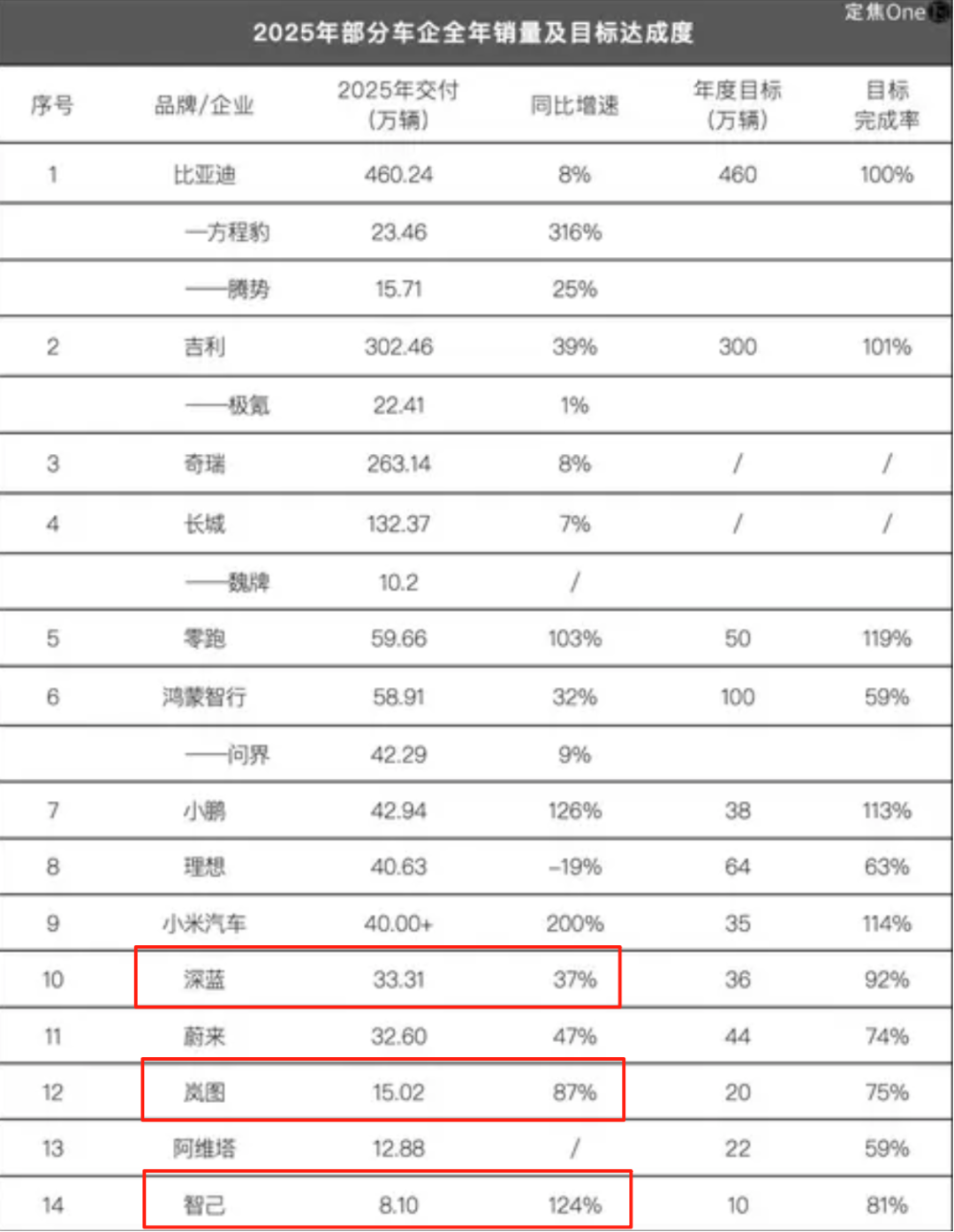 同样能突围的还有深蓝汽车。2025年深蓝汽车完成了近34万辆的交付,年度目标完成率达到92%。这一目标完成率,不仅在“创二代”中遥遥领先,也高于很多第一梯队的车企。