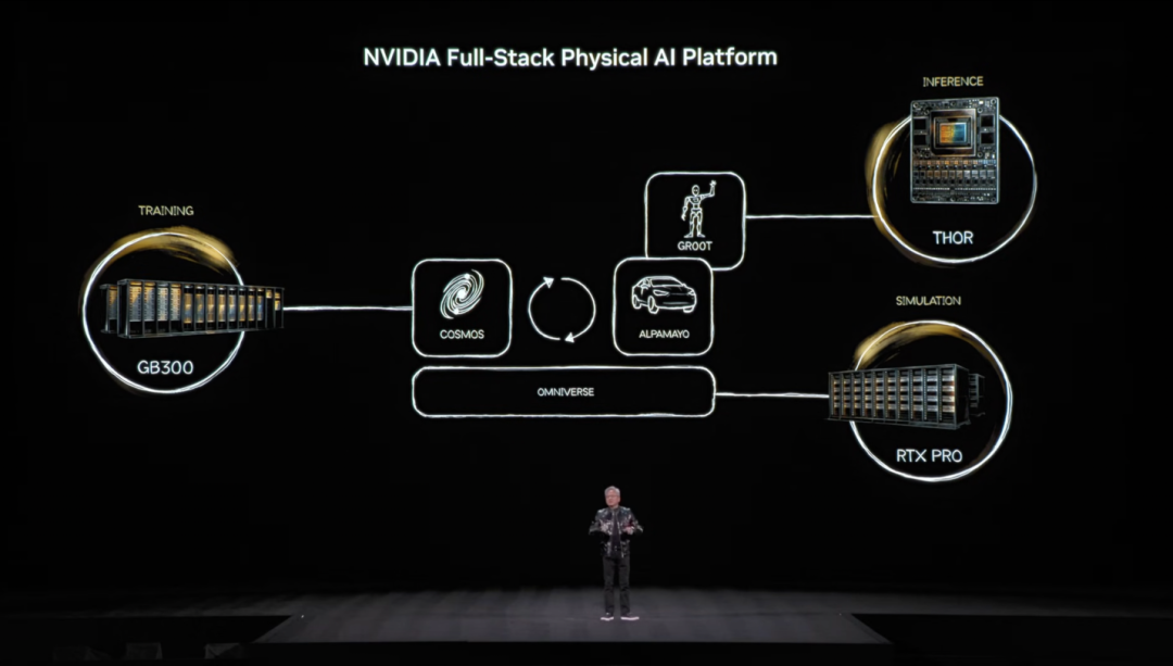 进入到 2026 年,英伟达对于物理 AI 的布局已经趋于完善。其中一个最为直接的证据是,在本次 CES 的演讲中,黄仁勋专门介绍了英伟达的全栈物理 AI 平台(Full-Stack Physical AI Platform)。