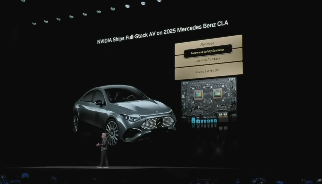 具体来说,黄仁勋宣布,首款搭载 Alpamayo 系统、基于 NVIDIA DRIVE 全栈辅助驾驶平台构建的乘用车(即奔驰 CLA 车型)即将亮相——该车型目前采用双 Orin 处理器,下一代是双 Thor 处理器。