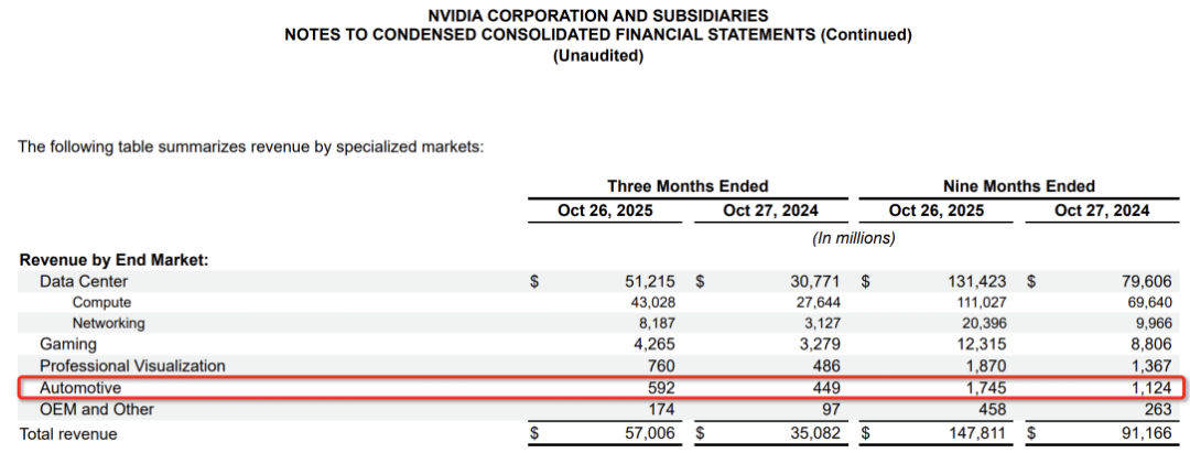根据英伟达发布的截至 2025 年 10 月 26 日的最新一季度财报,在英伟达当季度的 570 亿美元营收中,来自汽车和机器人业务板块的营收为 5.92 亿元,同比增长幅度为 32%,但相比于营收大盘来说,确实是微不足道。