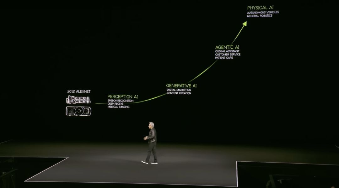 到了 2025 年 3 月,黄仁勋又在当年的 GTC 大会上表示,AI 经历了三代技术范式的转移,从感知 AI 到生成式 AI,再到 Agentic AI,接下来将会是物理 AI(Physical AI)的时代。