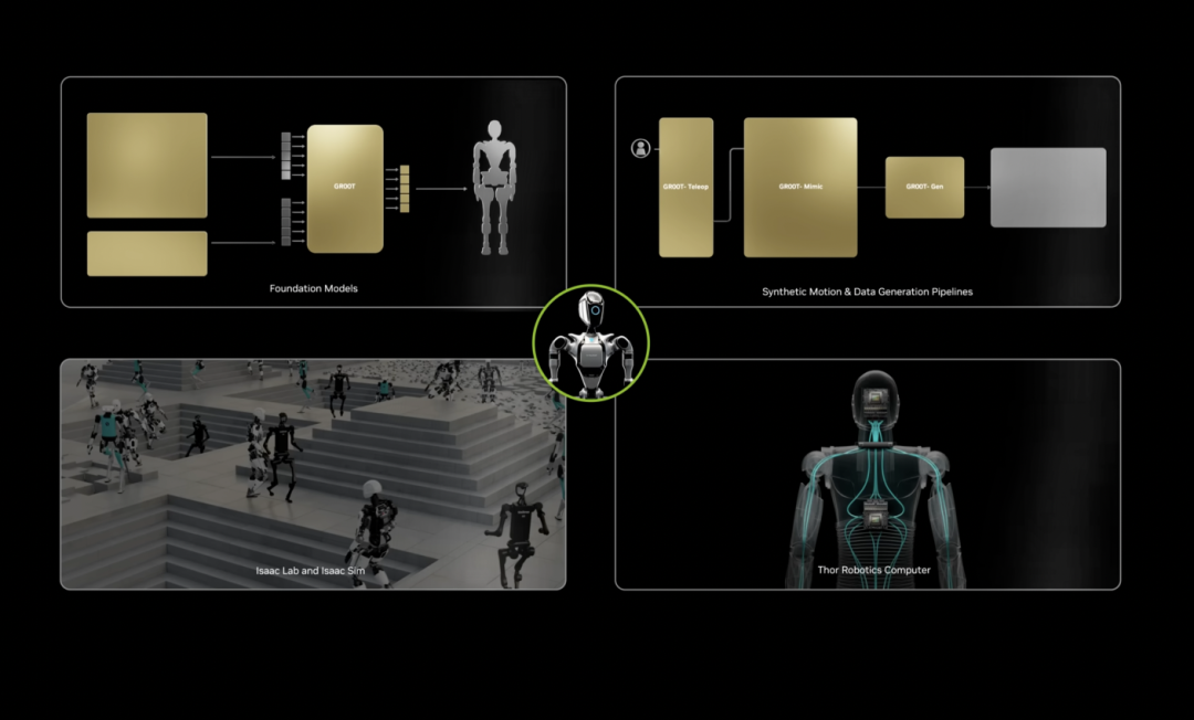 比如,早在 2024 年 3 月的 GTC 期间,英伟达就发布了人形机器人通用基础模型 Project GR00T,瞄准了人形机器人和具身智能;不仅如此,英伟达还发布了基于 NVIDIA Thor 的新型人形机器人计算机 Jetson Thor。