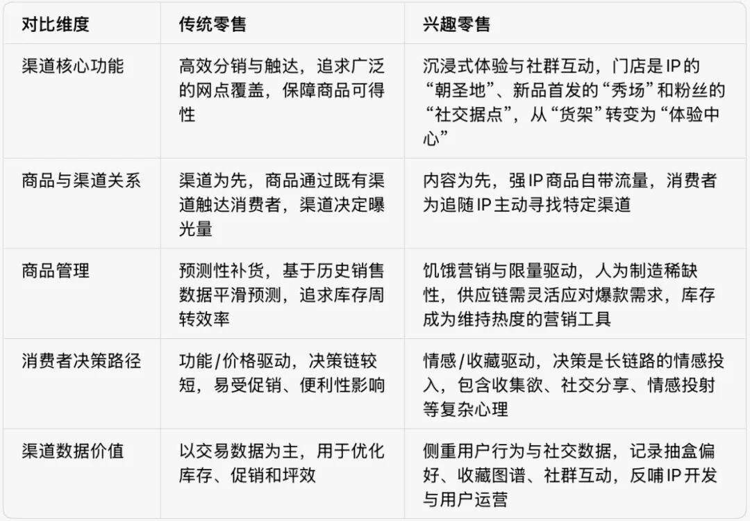 由此可见,我们不能用传统零售的逻辑来解读兴趣零售。从渠道运营的本质来看,两者存在根本性差异:传统零售的核心是“渠道驱动销售”,而兴趣零售则是“内容驱动渠道”,其渠道不再是简单的商品流通管道,而是“IP体验的延伸触点”。