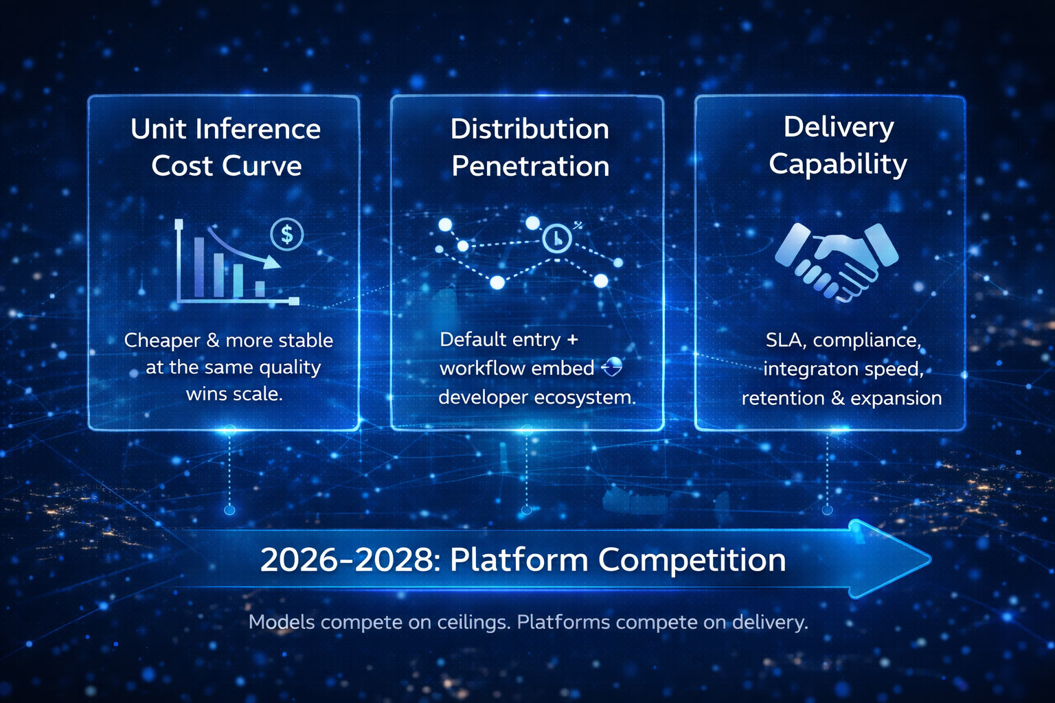 DeepSeek 这类新一代玩家说明第一层突破仍可能来自更灵活的组织形态,但要在 2026–2028 获得更大份额,最终仍要回答第二层与第三层问题,底座确定性、入口渠道与收入沉淀缺一不可。