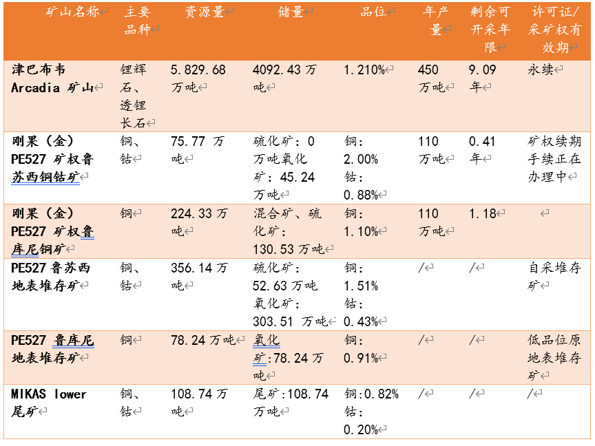 其中刚果金PE527矿权权项目剩余可开采年限仅0.41年、1.18年,但鉴于公司在当地布局多年,矿权续期手续正在办理中,预计可通过勘探和收购补充资源。