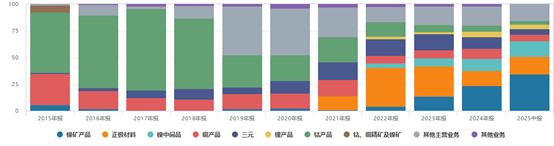 这一过程中,华友钴业形成了“总部在浙江、资源在境外、制造基地在中国、市场在全球”的空间布局。25年半年报显示,海外与中国收入占比为64:36。