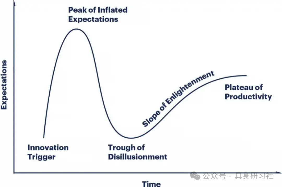 全球领先的技术研究与咨询公司Gartner提出了一个新兴技术成熟度曲线,在机器人赛道也值得参考借鉴。这条曲线包含五个阶段:技术萌芽期,概念引发关注;期望膨胀期,媒体炒作推高预期;泡沫幻灭期,实际效果低于预期;复苏期,务实应用逐渐成熟;生产力稳定期,技术价值被广泛认可。
