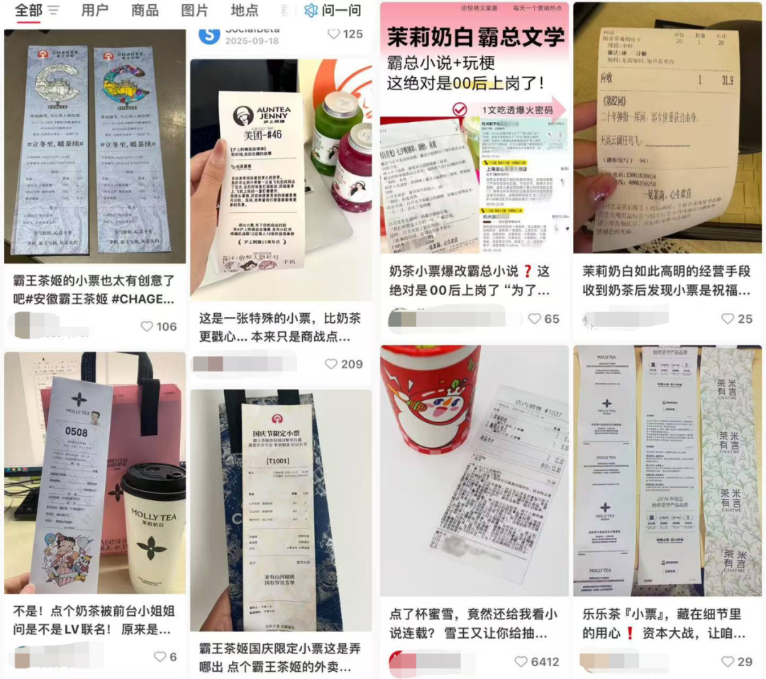 以霸王茶姬为例,在三年前的高速扩张期,各区域、门店及员工的新媒体账号为其带来了现象级曝光。同样,近期茉莉奶白因“抽象小票”走红,各品牌也争相模仿,也为品牌带来了年轻化热度。