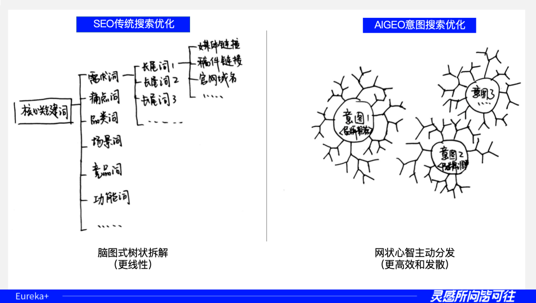 SEO是树状结构,是从核心搜索关键词延伸到长尾词,再对应到具体的媒体文章或域名链接的线性呈现。然而,AI之所以被称为“人工智能”,在于它有“智”——它可以进行复杂的决策判断,并拥有自由生长的心智。因此,GEO是网状结构。品牌和产品要解决的,是“独立意图”下AI对你的记忆。只要让AI看见你、理解你、记住你,你的品牌就能有无数种可能性,被AI主动推荐给那些需求千变万化的消费者。