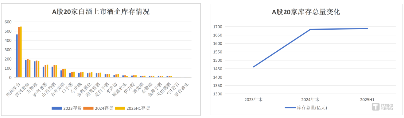 从规模以上企业库存总额来看,白酒库存呈现持续攀升态势:2023年20家白酒上市公司库存总额约1461亿元;2024年约1684亿元;2025年上半年超过1688亿元。