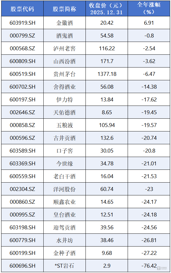 二级市场同步遇冷。从全年来看,白酒板块整体呈现“高位回落、震荡筑底”的特征。截至2025年12月31日,中证白酒指数报2694.38点,板块总市值降至2.88万亿元,较年内高点明显缩水,市盈率一度跌至近十年低位。个股中仅金徽酒实现微涨,11家公司跌幅超20%,反映出市场对行业短期前景的悲观预期。