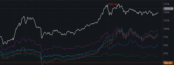 白:申万消费电子。紫:上证指数。绿:申万电子指数