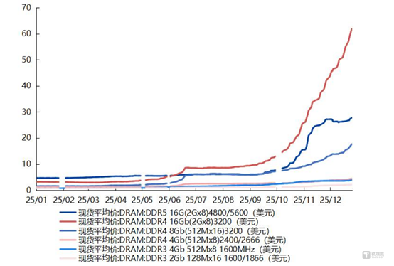 但9月下旬开始,市场开始担忧存储芯片价格上涨对终端需求的抑制作用,尤其对成本敏感的中低端机型可能造成冲击,板块由此进入震荡下行通道。全年,DDR5内存价格累计涨幅超过120%;LPDDR5X手机内存价格翻倍;NAND闪存涨幅突破300%,涨价风暴从供应链上游持续向下传导,不断刷新PC与手机市场的产品定价、配置策略与竞争格局。![]()