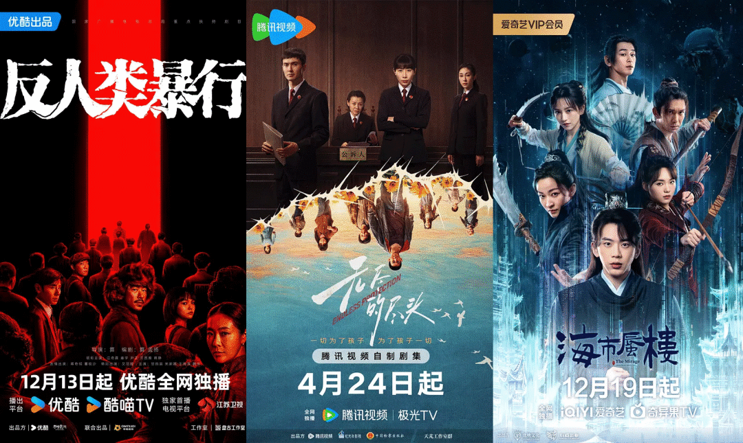 这一点也体现在高分剧的分布上,综观豆瓣评分8分以上的9部长剧,爱腾优三家各占3部,优酷的《反人类暴行》、腾讯视频《无尽的尽头》、爱奇艺的《海市蜃楼》分别为各平台最高分获得者,侧面反映出平台在创作品质的把控上日趋稳定。