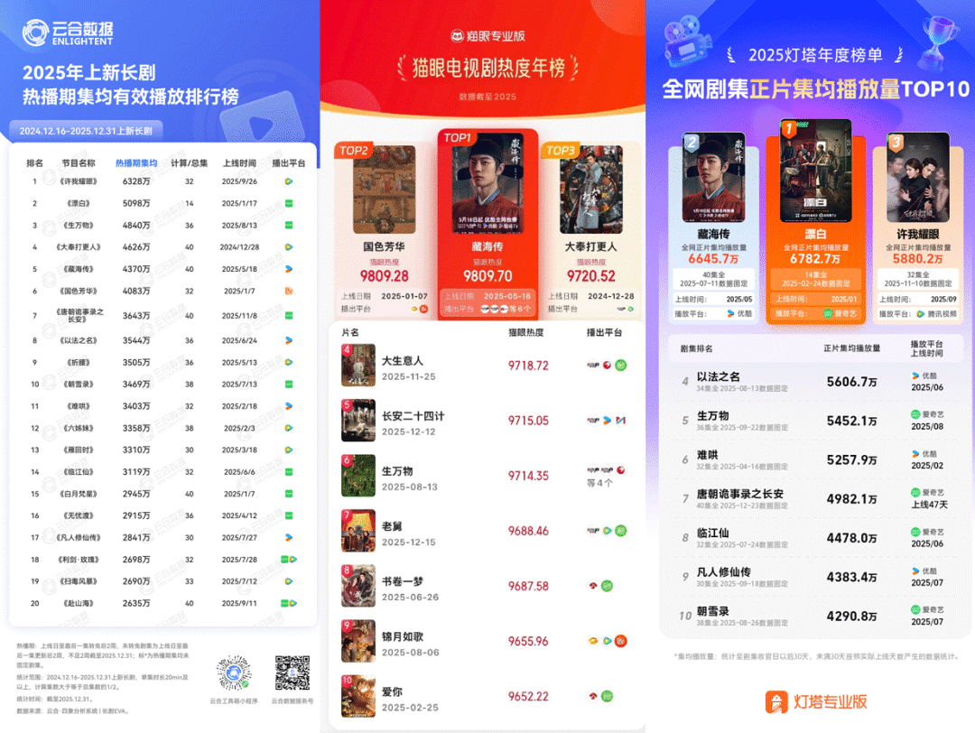 变与不变之中究竟得失几何?本文将结合云合、灯塔、猫眼、德塔文等第三方平台公布的年度数据报告或榜单,详细回顾2025年长剧市场在这一年的具体表现,也为刚到来的2026提供可供参考的一二经验及反思。