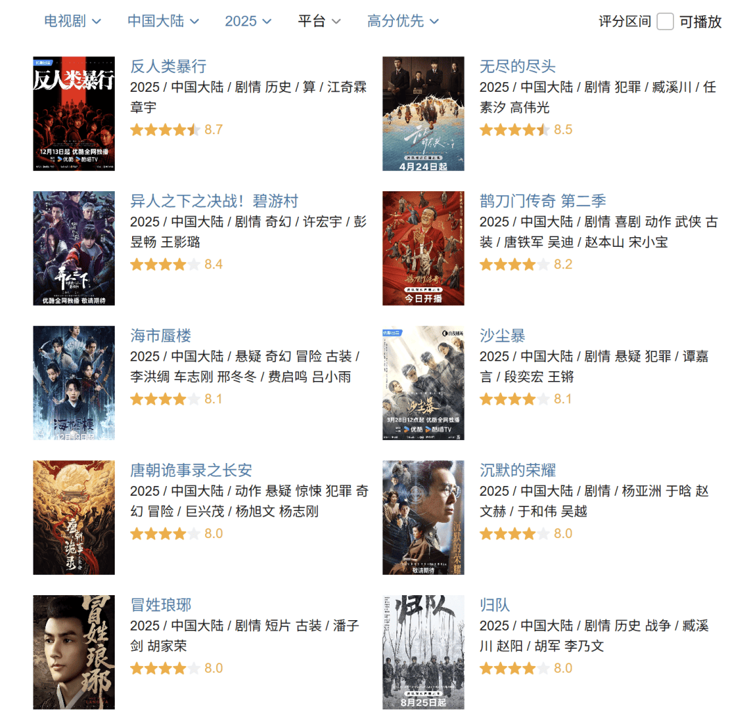 口碑上同样呈现出相似趋势,虽说2025年豆瓣评分8分以上的长剧数量较去年略有增加,但8.5分及以上的作品仅有两部且最高分为8.7,8分左右的占据半数以上;再观2024年同期,加上斩获9.6高分的《山花烂漫时》,8.5分及以上的剧集就有4部。而如若把时间线在拉长到近三年,高分剧的直线下降势头会来得更为“扎心”。