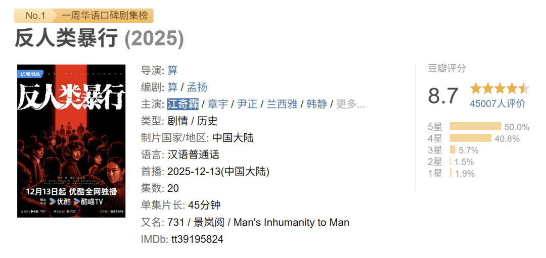 只是比起2024年24.6万人打出9.6分的《山花烂漫时》和2024年近115万人评出9.4分的《漫长的季节》,今年国产长剧的“口碑之最”只有不到5万人打分,这样的破圈程度恐怕无论如何都称不上是“大众可见”。