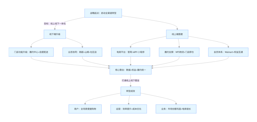 在电商冲击下,沃尔玛并未像传统零售商那样被动,而是以“线上线下融合” 的主动思路,从2016年大力加码电商开始,实现了平稳转型,最终形成了与亚马逊等的差异化优势。