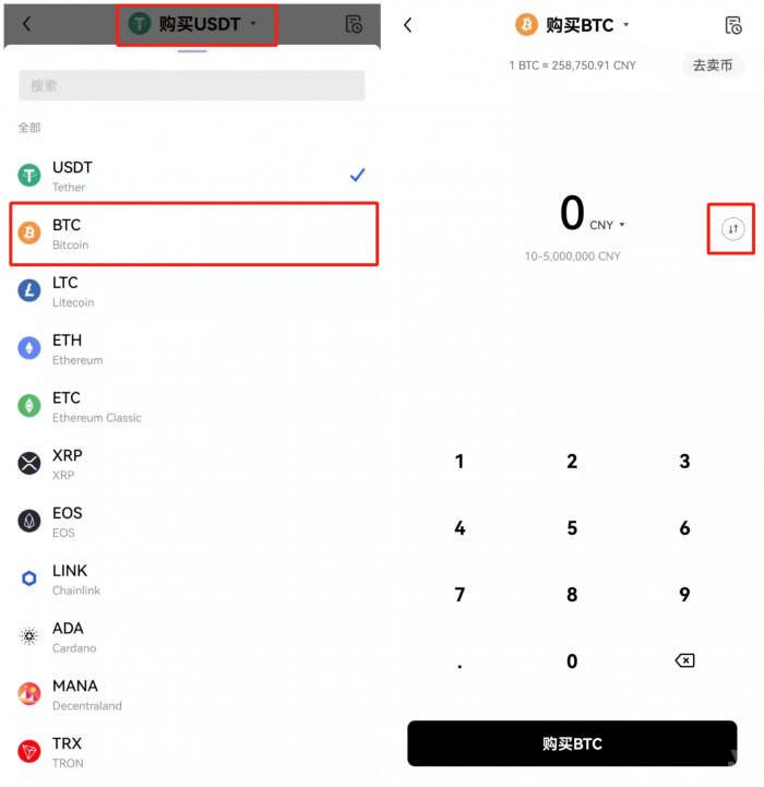 第二步:将购买币种切换为,输入需要购买的金额/数额,点击“购买”。点击如图所示的按钮即可完成“按金额购买”/“按币种数量购买”的切换。