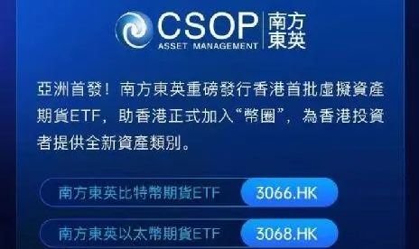 今天上市的两只新ETF — 南方东英(CSOP)比特币期货ETF及南方东英以太币期货ETF由南方东英资产管理有限公司管理,分别追踪在芝加哥商品交易所(芝商所)交易的标准化、现金结算的比特币期货合约及以太币期货合约。