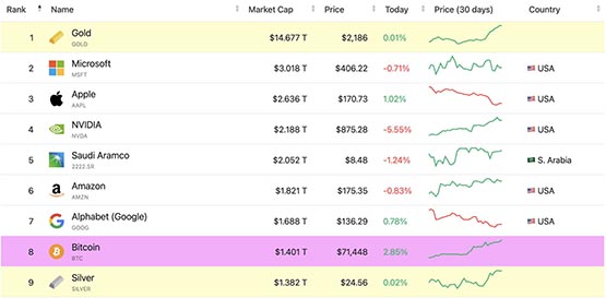 如今,比特币现货ETF在一月通过后,吸引大量的传统金融市场的资金进场,资产规模高达数千亿美元的机构,大开合规渠道投资BTC的大门,两个多月来已为BTC带来9.59亿美元的资金,比特币更ㄧ跃超越白银,成为全球第8大资产。