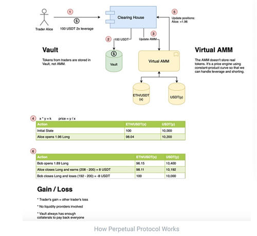永续协议的虚拟自动做市商沿用了与Uniswap V2相同的恒定乘积公式。正如“虚拟”二字所言,做市商机制里面并不存在真实的资产池。真实的资产存放在智能合约建立的金库内,并由智能合约管理做市机制支撑的所有资产。相对于传统的自动做市商机制,永续协议使用虚拟自动做市商作为价格发现机制,而不是用作现货交易。