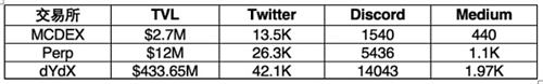 以下是三个项目的总锁仓量 - TVL,各大社交媒体的订阅者或成员数量。