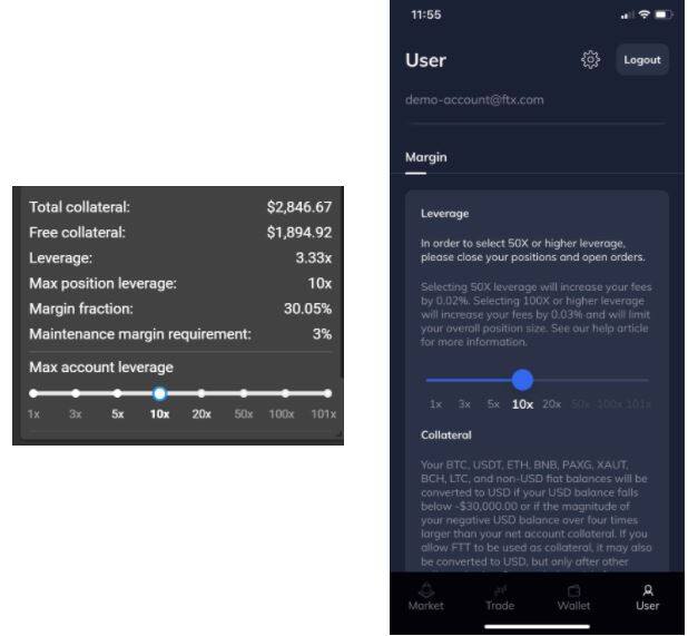您的杠杆指您的仓位数量除以您的保证金。就此而言,假设我的仓位大约为9000美元,而保证金仅为3000美元,则我的杠杆约为3.33倍。您的保证金率仅为1/杠杆:您的账户价值除以仓位数量。您的最高仓位杠杆指您可拥有的最高杠杆倍数。您可使用滑杆上调或下调。应注意,此操作不会发出任何委托单或变更您的现有风险情况,而仅仅是改变您可面临的最高风险。最后,您的维持保证金率需求指您的保证金率应为多高方能避免清算。若您的保证金率低于维持保证金率,则您账户中的头寸将由FTX的风险引擎强制平仓。