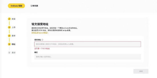 10、输入可以接收铭文的比特币地址。这应该是一个兼容ordinals协议的地址。建议使用P2TR地址,其特点是具有独特的bc1p前缀