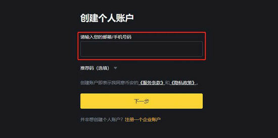 2、币安已全面开放大陆用户进行手机号注册,输入邮箱/手机号、点击下一步即可