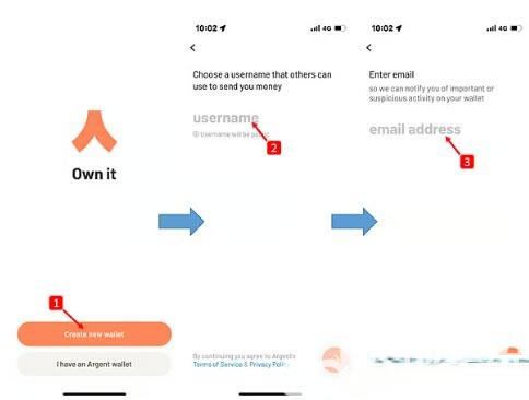■ 开启app后,要开始注册啰,点选「Create new wallet」,输入username(使用者名称),然后再输入email address(个人电子信箱)。