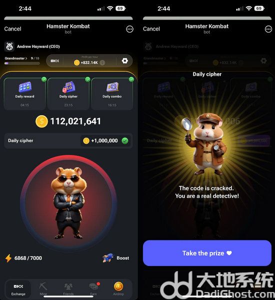 Hamster Kombat 重新设计的界面,带有“每日密码”按钮。图片来源:Decrypt