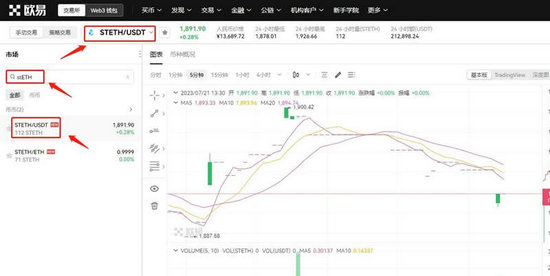 6、在此页面找到搜索栏,输入币种简称stETH,选择stETH/usdt交易对