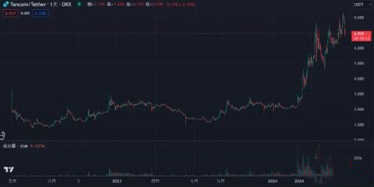 $TON 代币价格在近期表现得也特别强势,相比较去年价格已经成长将近7 倍,由于其发行量较大,成长幅度相当可观,也代表市场对于其接受度不断拉高。