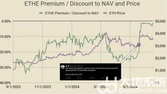 然而,当我们观察以太坊 ETF 的筹备情况时,发现情况几乎完全相反。直到 3 月 20 日,几乎没有市场讨论,而就在那天,彭博分析师将他们的胜算从 25% 提高到 75% 。同一天,SEC 要求交易所为现货以太坊 ETF 做好准备的消息得到确认。随后,ETHE 价格飙升,三天后,上市正式获批。从那时起,ETHE 回到了接近其净资产价值的水平。