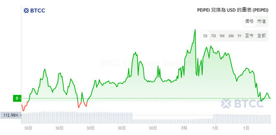 截止7 月1 日,PEIPEI 的交易价格为$0.00000026,在过去24 小时上涨了68.13%,最高达到$0.0000002821,刷新历史高点。